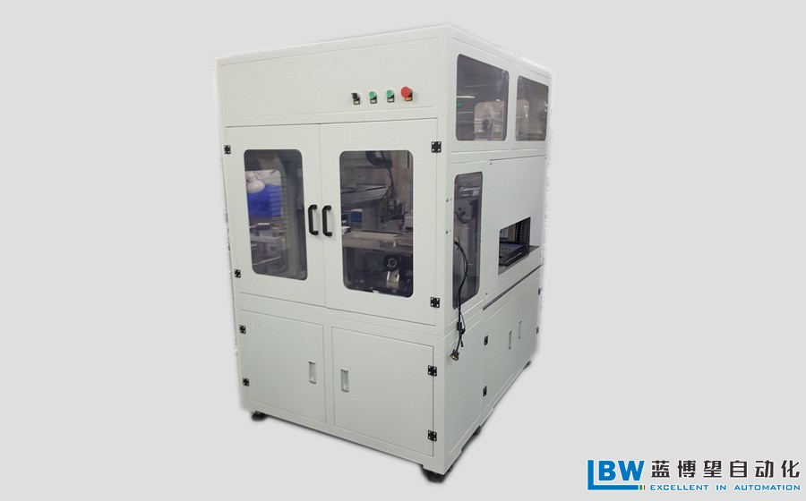 該設(shè)備為在線式點(diǎn)膠機(jī),產(chǎn)品或由專用的產(chǎn)品工裝從設(shè)備的側(cè)方左進(jìn)右出或右進(jìn)左出,傳送到設(shè)備內(nèi)部并對產(chǎn)品進(jìn)行簡單的定位夾緊,使產(chǎn)品具有相對一致的位置,然后利用位于機(jī)械手頭部的相機(jī)組件對產(chǎn)品上的Mark點(diǎn)進(jìn)行拍照定位。定位完成后設(shè)備開始到事先程序建立的位置進(jìn)行點(diǎn)膠,點(diǎn)膠完成后,松開產(chǎn)品,產(chǎn)品或帶工裝的產(chǎn)品經(jīng)由設(shè)備內(nèi)的鏈板線自動(dòng)流至下一個(gè)工位。